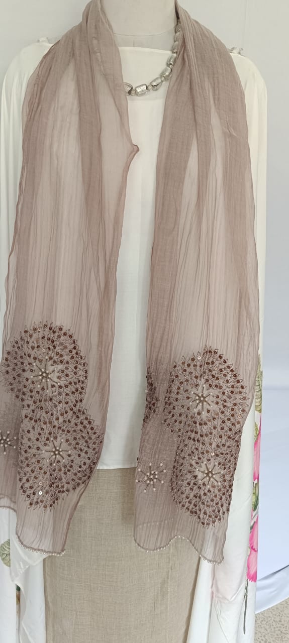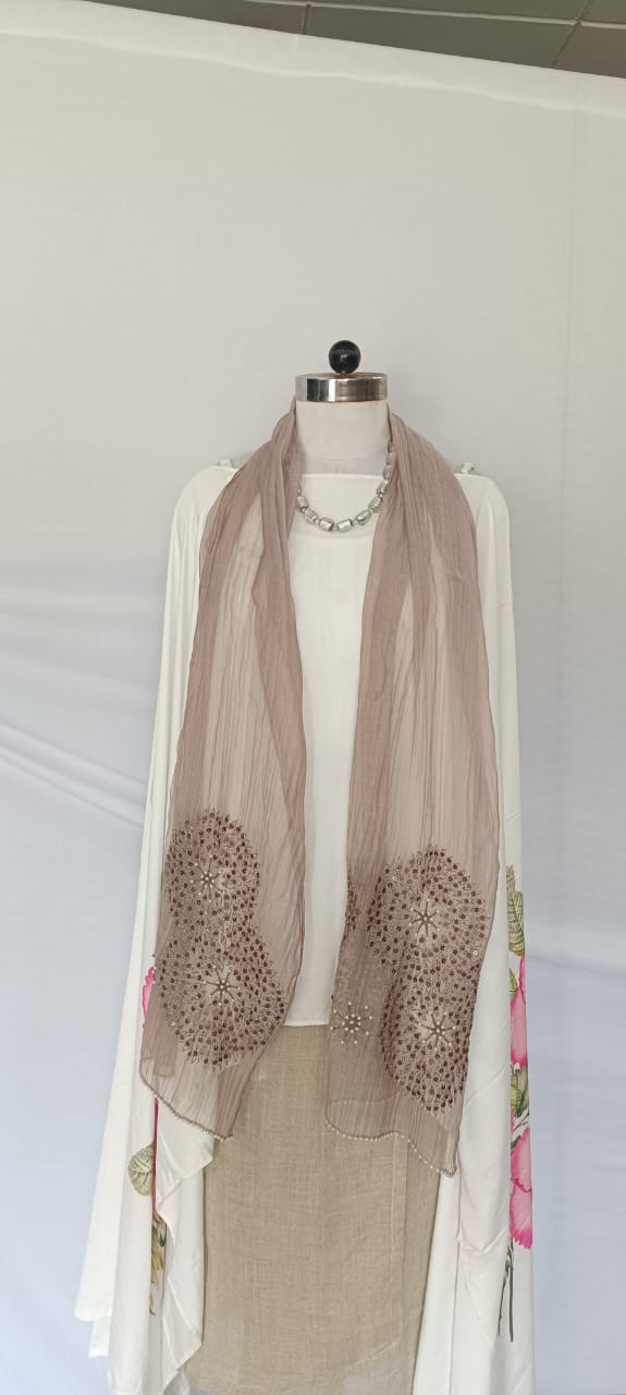 Delicately woven from a luxurious blend of cotton and silk, this brown scarf is a quiet ode to elegance. The soft, natural hue exudes understated grace, while intricate embroidery dances gently across the fabric, adding texture and character without overwhelming its subtle charm. Lightweight yet refined, it drapes effortlessly — a timeless accessory that pairs as beautifully with casual layers as it does with evening sophistication. Whether worn wrapped, knotted, or loose, it speaks of thoughtful craftsmanship and quiet confident.